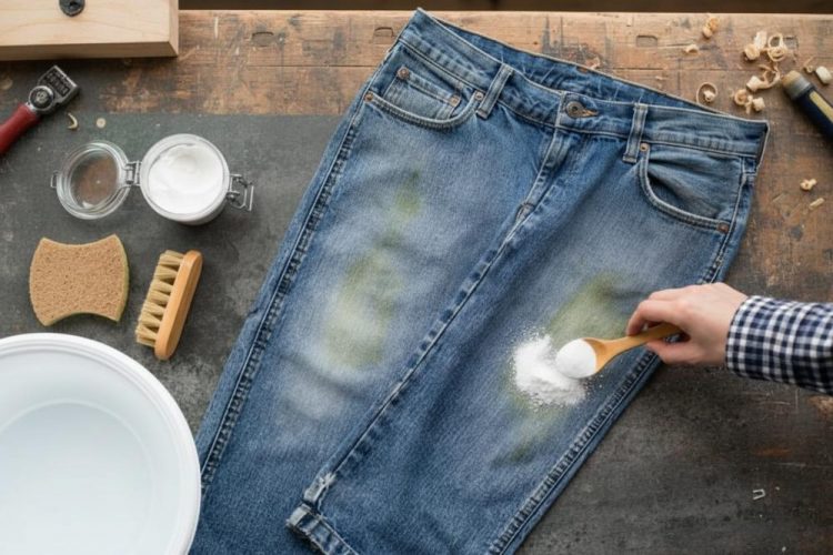 Підходить для розтягнутих джинсів – луг пом’якшує тканину. Якщо пляма на швах, використовуй губку з вивороту.