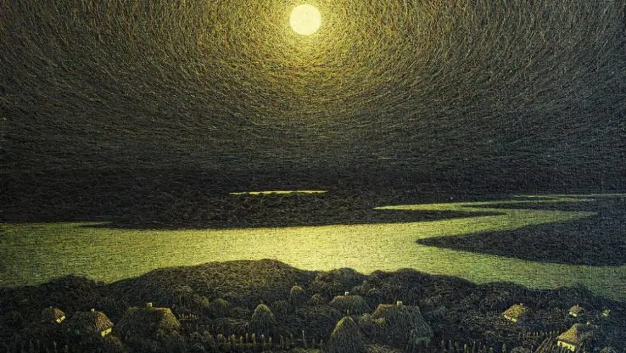 1981 рік, акрил 68×78 см. Ніч не темна, а золота – пльонтанізм плете ауру таємничості, де дерева танцюють у променях, а небо виблискує. Це пік розквіту, коли Марчук переміг цензуру душею. Рекорд 96,8 тис. дол. – колекціонери бачать у ній вічність.