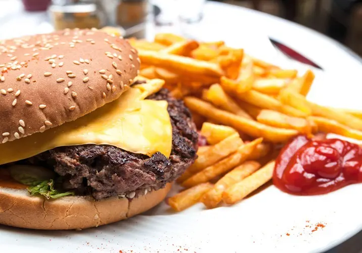 - Комбінування калорійних продуктів. Бургер із картоплею та коктейлем — це калорійна “бомба”. Краще обирати одну калорійну страву за раз.