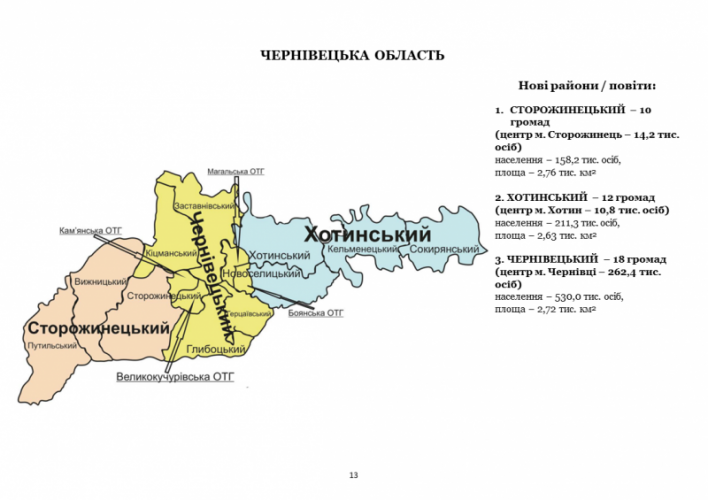 До реформи 2020 року Чернівецька область мала 11 районів: Вижницький, Герцаївський, Глибоцький, Заставнівський, Кельменецький, Кіцманський, Новоселицький, Путильський, Сокирянський, Сторожинецький та Хотинський. Кожен був маленьким королівством зі своєю адміністрацією, але це призводило до неефективності – дублювання функцій, бюрократія. Реформа укрупнила їх до трьох, об’єднавши сусідні території.