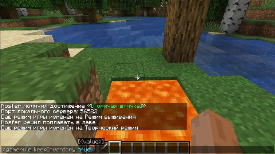 Створіть новий світ або завантажте існуючий – головне, увімкніть читерство під час генерації. Натисніть Esc, відкрийте чат (T на ПК) і введіть /gamerule keepInventory true. Екран блимне повідомленням “Gamerule keepInventory is now set to: true”. Тепер помріть від скелета чи лавового кубика – і переконайтеся: меч на місці, XP не зник.