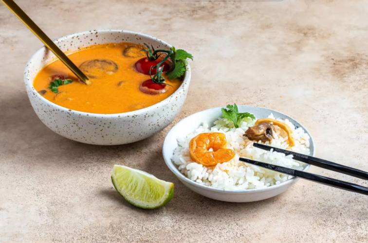 У Таїланді том ям часто подають із клейким або жасминовим рисом – це не просто гарнір, а спосіб збалансувати гостроту! Рис пом’якшує пікантність і робить страву ситнішою. Їсти їх разом – справжня традиція.