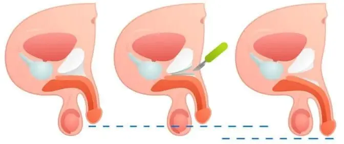 - Подовження члена: під час цієї процедури хірург відрізає зв’язки, які прикріплюють член до лобкової кістки, що дозволяє йому “висунутися” вперед.