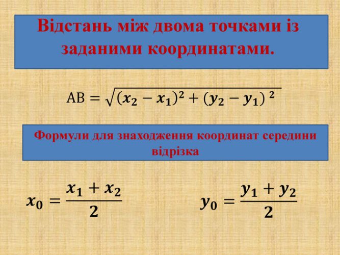 | Середина відрізка | ( (x1+x2)/2 ; (y1+y2)/2 ; (z1+z2)/2 ) | A(1;2;3), B(5;4;1) → (3;3;2) |