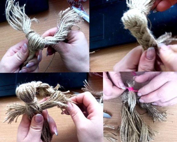 - Перев’яжіть червоною ниткою посередині, формуючи голову.